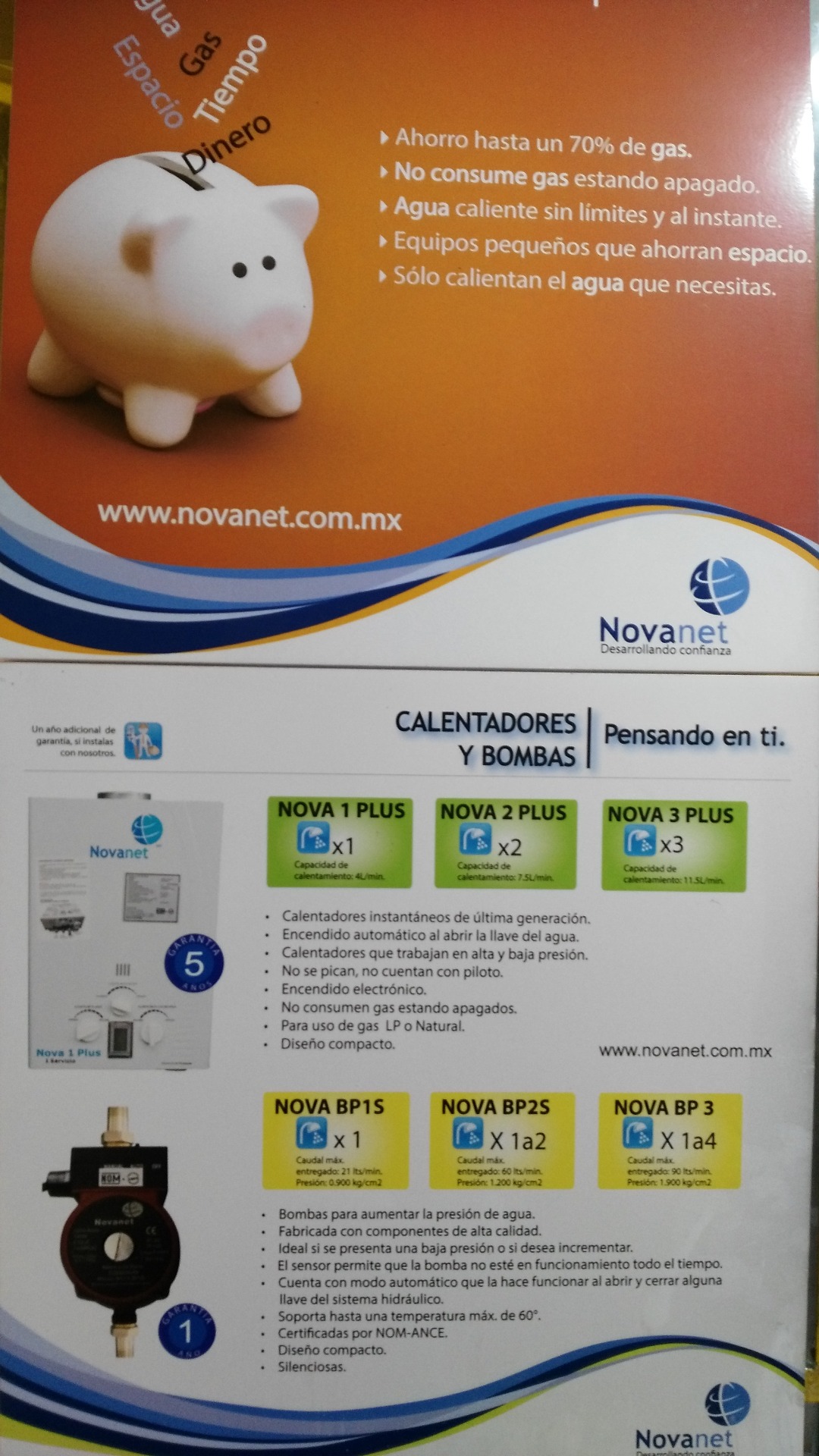 Calentador marca NOVANET de paso 1 servicio 70% de ahorro de gas incluye: bomba presurizadora, pilas y juego de mangueras para su instalación 5 años de garantía a solo $ 3,390.00